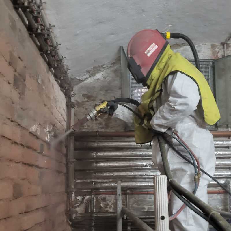 - Niederdrucksandstrahlen mit Wasserzusatz (vor allem für Fassadenreinigung, auch Feuchtsandstrahlen genannt): Wie oben aber durch speziellen Strahlkopf kann dem Luft-Sandstrahl- gemisch Wasser beigefügt werden, um noch schonender zu reinigen und Staubentwicklung zu vermeiden. Niederdrucksandstrahlen eignet sich vor allem für größere Flächen. Druck und Sandmenge lassen sich optimal einstellen.